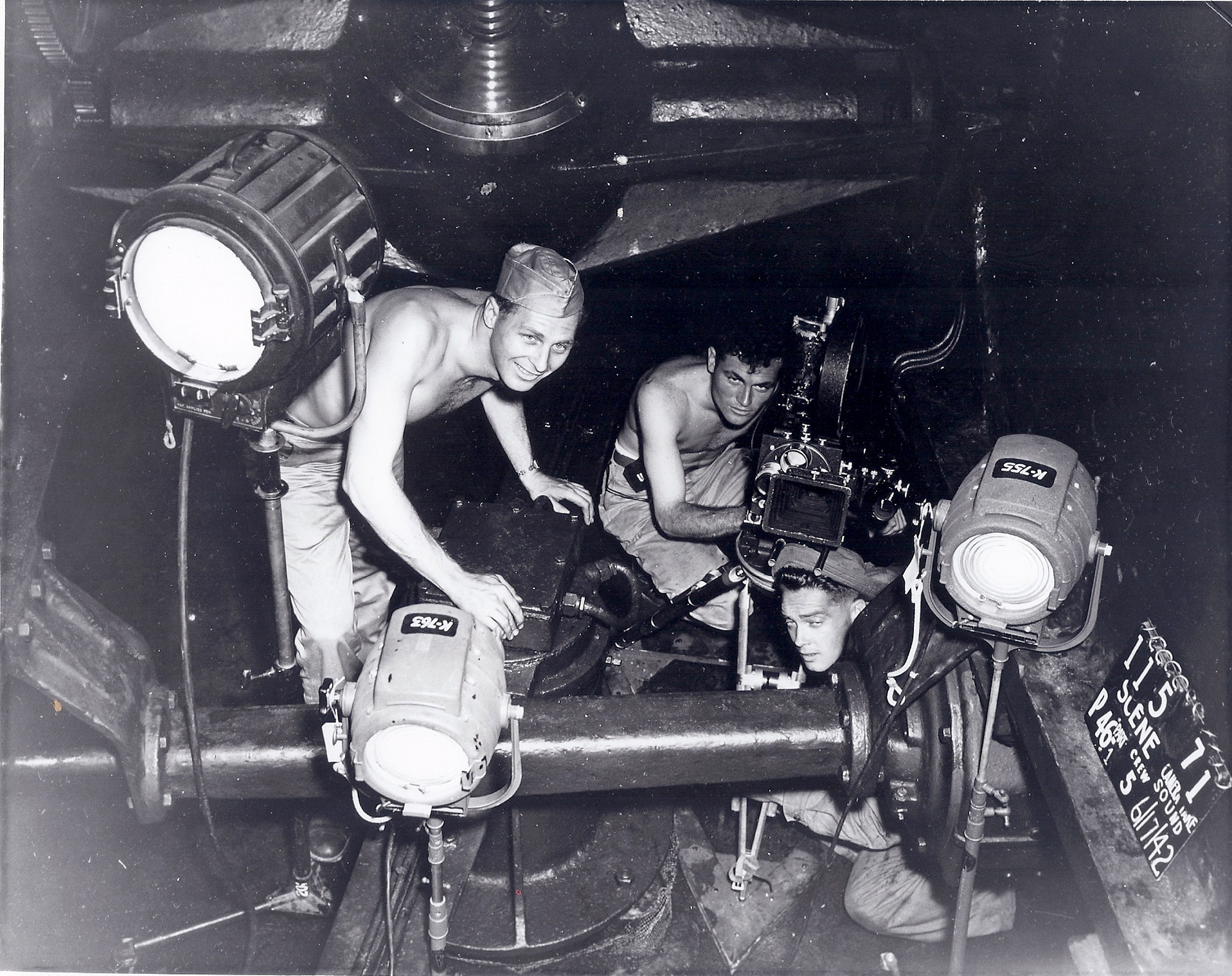 This picture is of the film crew in the carriage mount area with the gun above them. Note the date of clapper board of 6/7/1942.